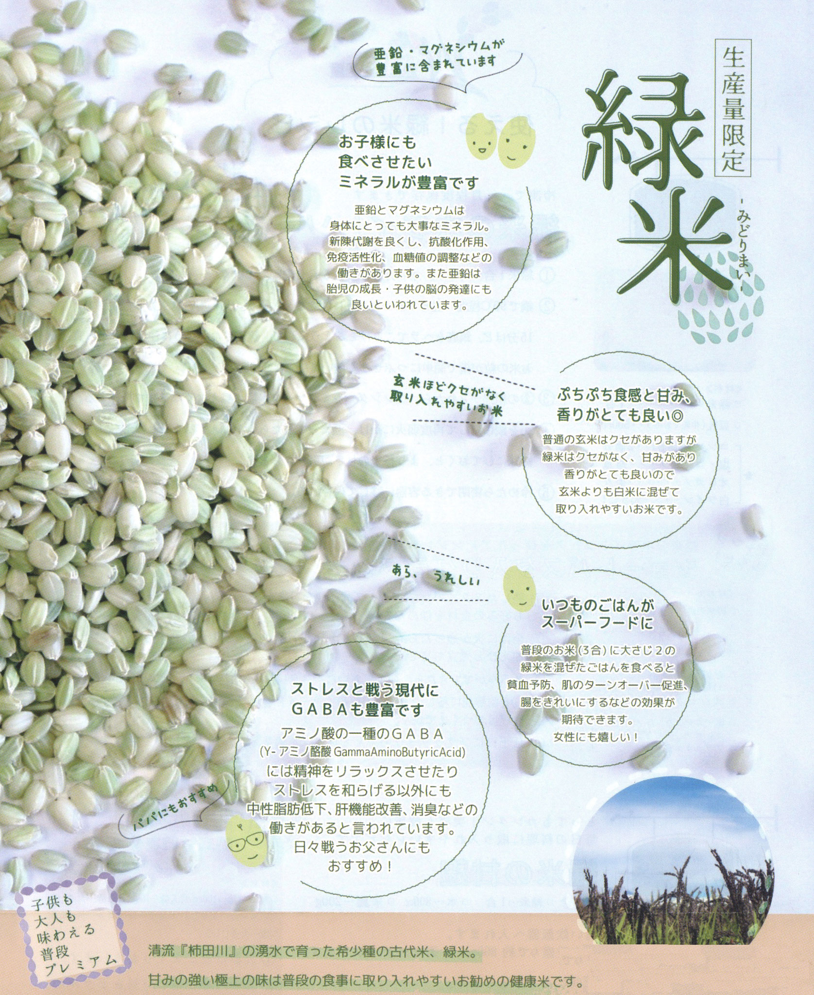清流『柿田川』の湧水で育った希少種の古代米、緑米。 甘みの強い極上の味は普段の食事に取り入れやすいおすすめの健康米です。 11月10日(月)より緑米の販売開始します。ぜひお買い求めください。